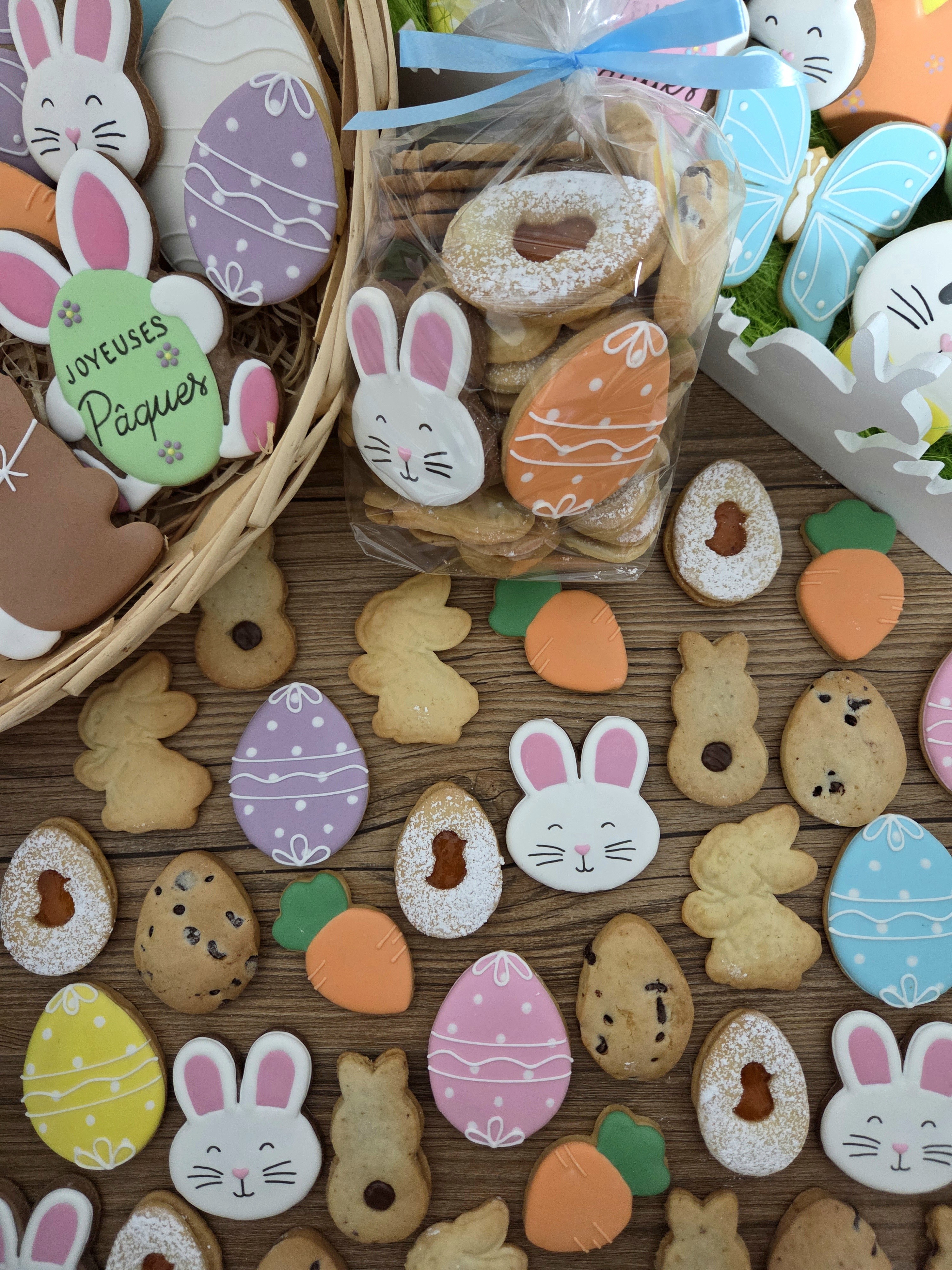 Un sachet de 250g, contenant: des biscuits à la confiture d'abricot, des biscuits aux noix et à la pâte à tartiner (bio et sans huile de palme), des pépites de chocolats, et des biscuits décorés sur le thème de Pâques.